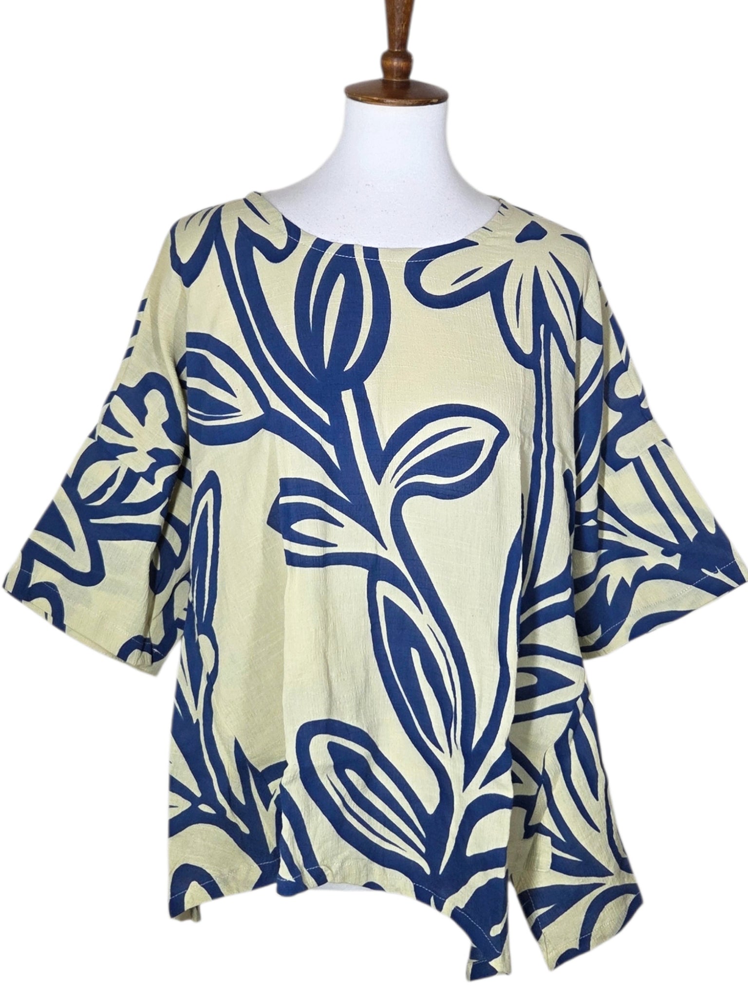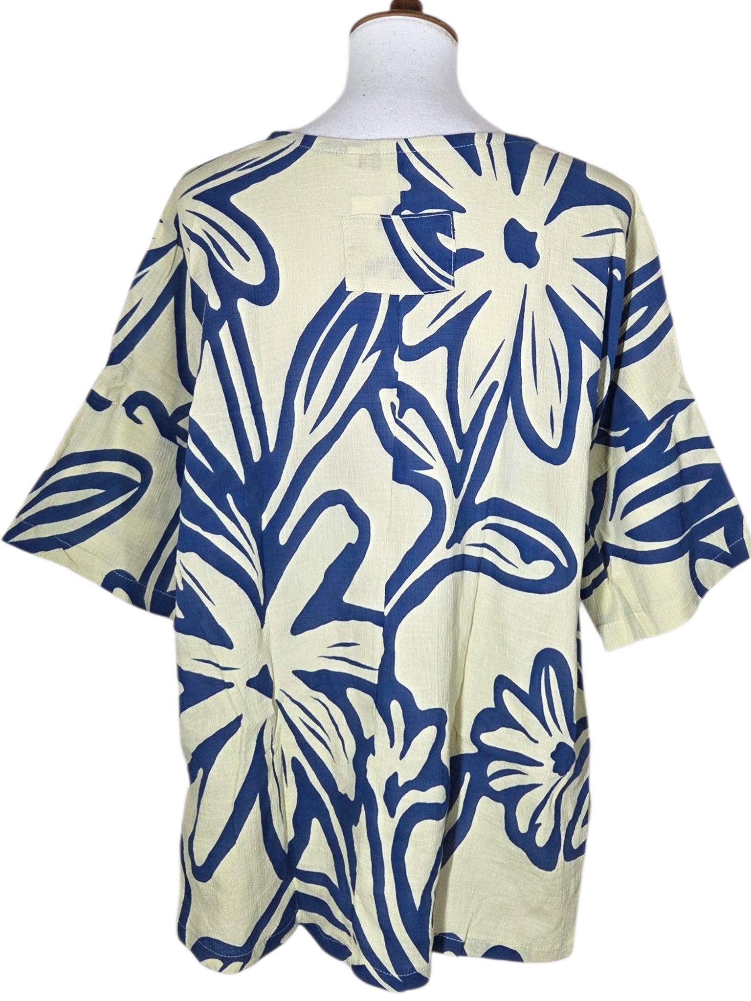 Side Slit Blouse - Natural Color - Daisy Paint Print - Azure Blue